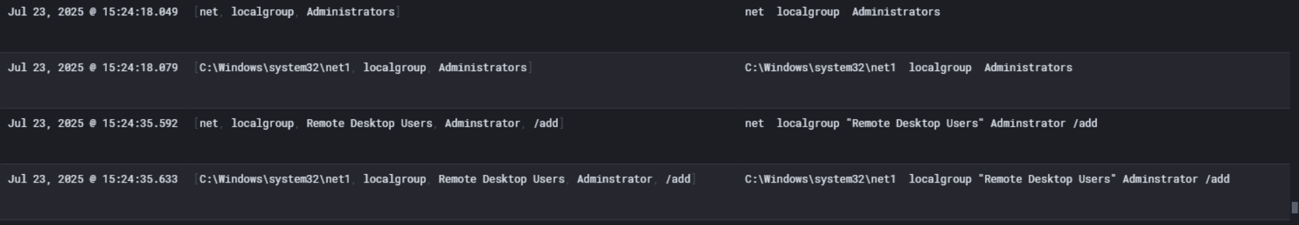 Right after that they wasted no time adding it to three groups: Administrators, Users, and Remote Desktop Users. That last one is key because adding to Remote Desktop Users means they set up RDP access on this machine, giving them a persistent graphical remote access path into ABPB-WKS02 anytime they want.