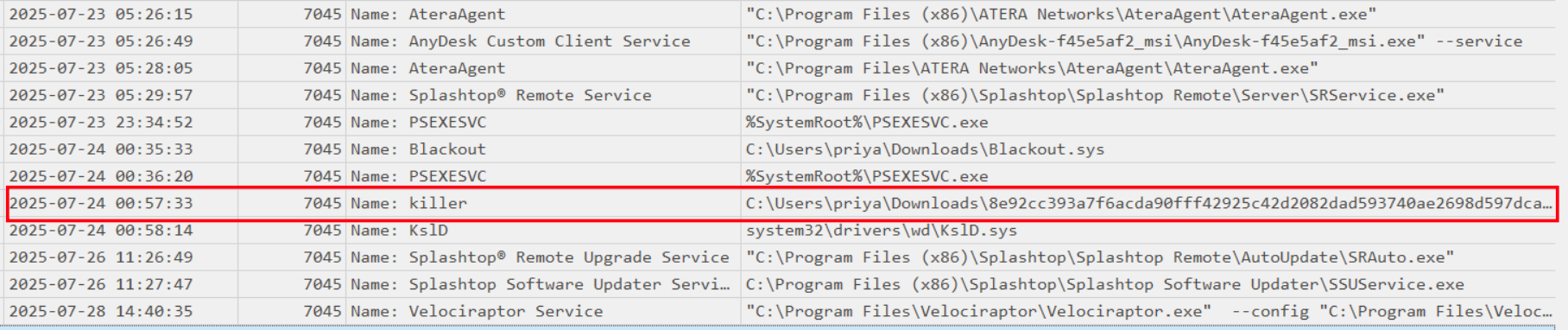 So while filtering Event ID 7045 for newly installed services, we spotted something very suspicious. A service named “killer” was installed on ABPB-WKS03 under the SYSTEM context, with the binary dropped in Priya’s Downloads folder at C:\Users\priya\Downloads\8e92cc393a7f6acda90fff42925c42d2082dad593740ae2698d597dca5d1e7fc.SYS.