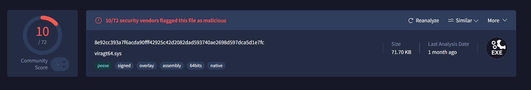 We took that SHA256 and ran it through our CTI platform and it came back as viragt64.sys, flagged 10/72 vendors on VirusTotal.