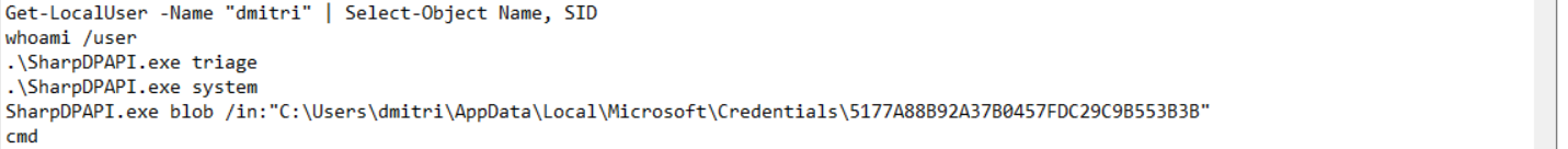 So while going through the PowerShell console history on ABPB-WKS02 under dmitri’s account, we spotted some very telling commands. The attacker first ran Get-LocalUser -Name “dmitri” and whoami /user to grab dmitri’s SID, then immediately jumped into SharpDPAPI.