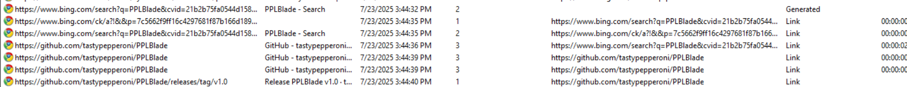 So jumping over to the browser history analysis on ABPB-WKS02, we can see the attacker was actively searching for PPL bypass tools on 7/23/2025. They searched for PPLBlade via Bing, landed on the GitHub repo https://github.com/tastypepperoni/PPLBlade, browsed around it, and then went straight to the releases page at https://github.com/tastypepperoni/PPLBlade/releases/tag/v1.0 to grab the binary.