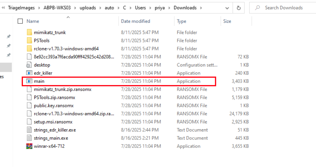 So shifting our focus over to ABPB-WKS03, we went through the contents of the Downloads folder and found multiple suspicious binaries sitting there. One that immediately caught our attention was main.exe.