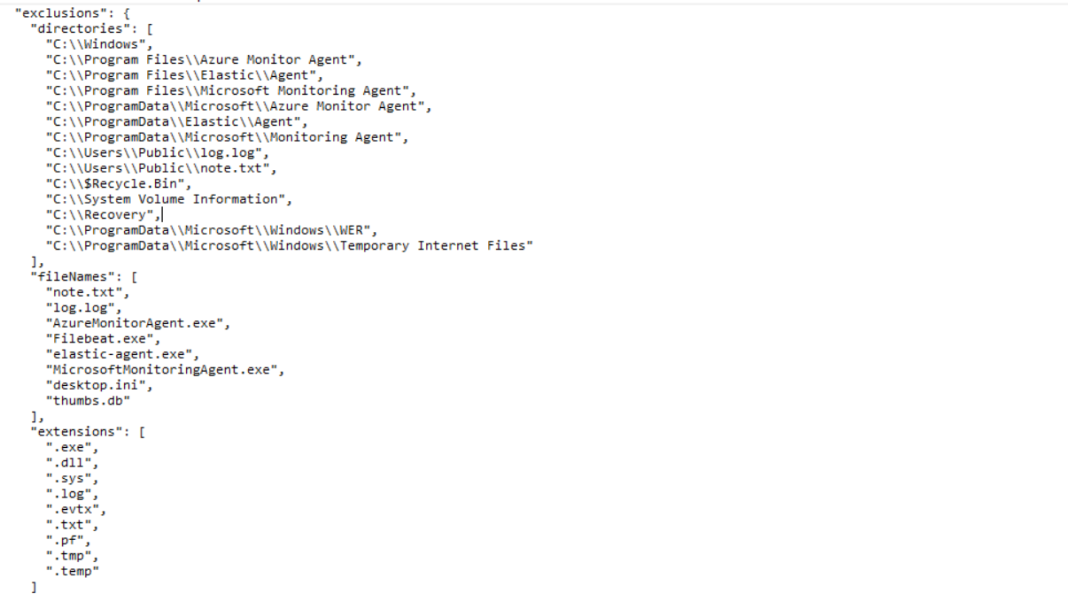 On the file side it excludes 8 specific filenames: note.txt, log.log, AzureMonitorAgent.exe, Filebeat.exe, elastic-agent.exe, MicrosoftMonitoringAgent.exe, desktop.ini, and thumbs.db. It also skips 9 file extensions from encryption: .exe, .dll, .sys, .log, .evtx, .txt, .pf, .tmp, and .temp.