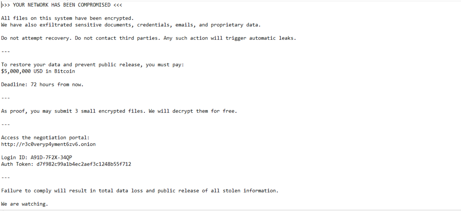 The intrusion concluded with the deployment of ransomware across the environment, a ransom demand of $5,000,000 USD in Bitcoin within 72 hours, and a dark web negotiation portal at http://r3c0veryp4yment6zv6.onion. This was a well planned, multi-stage attack consistent with Scattered Spider’s known TTPs, combining social engineering, living-off-the-land techniques, and ransomware partnership to maximize impact.