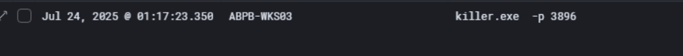 So we can see the actual execution of killer.exe on ABPB-WKS03 under priya’s account. The command run was killer.exe -n wazuh, directly targeting the Wazuh security agent by name to terminate it.
