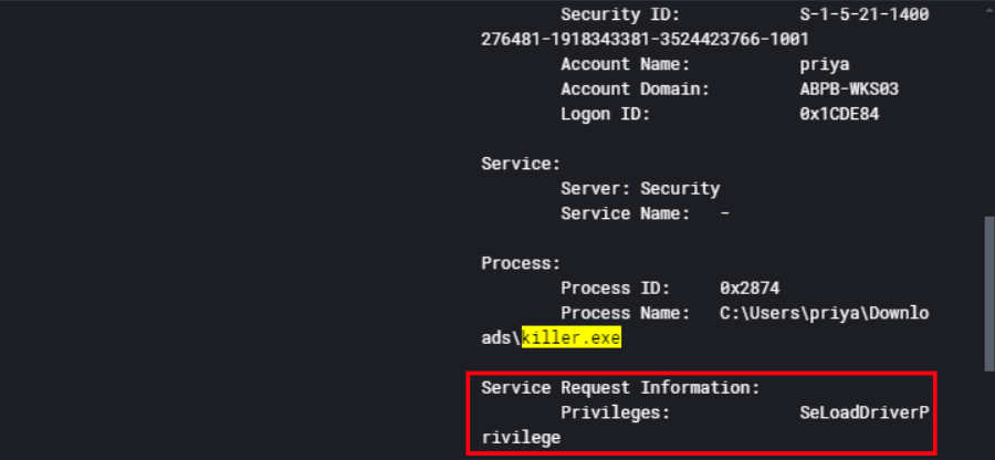 So another critical finding tied to this execution was the invocation of SeLoadDriverPrivilege by the malicious binary. This is one of the most dangerous Windows privileges you can have because it allows loading custom kernel-mode drivers directly into the Windows kernel.