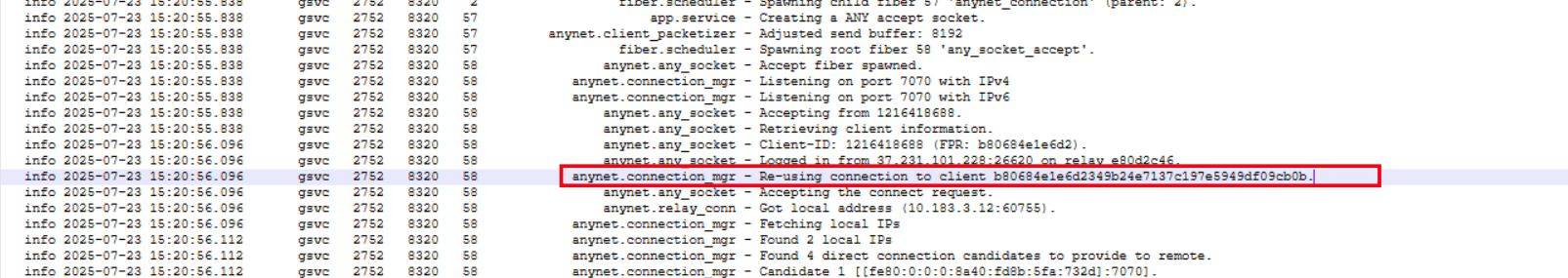 So looking deeper into the same AnyDesk log entry, we can pull out two more critical identifiers. The Client-ID of the attacker’s machine is 1216418688 with a Client Fingerprint (FPR) of b80684e1e6d2, and the connection was re-used to client b80684e1e6d2349b24e7137c197e5949df09cb0b.