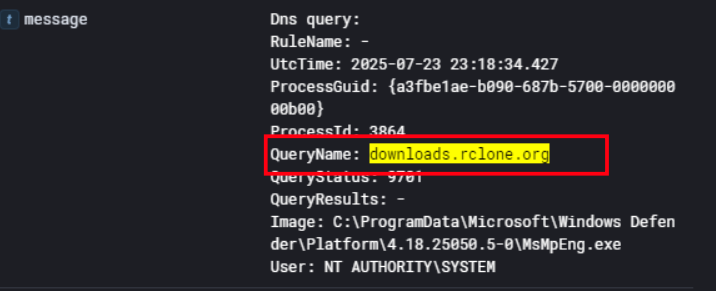 To back this up, the DNS logs show a query to downloads.rclone.org at 2025-07-23 23:18:34 from Process ID 3864, confirming the attacker downloaded rclone directly onto the machine.