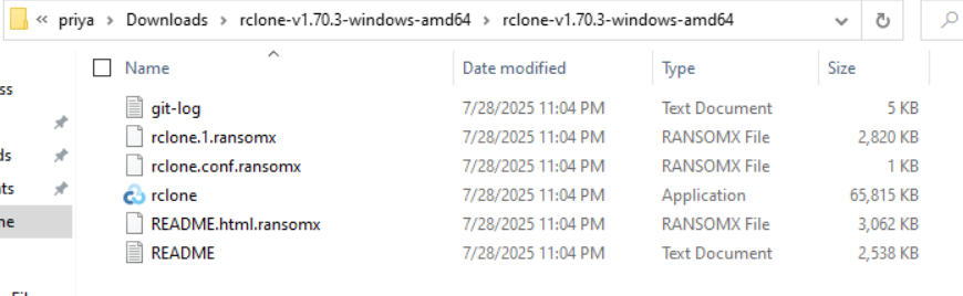 So moving into the exfiltration phase, we found rclone v1.70.3 sitting in priya’s Downloads folder on ABPB-WKS03 at C:\Users\priya\Downloads\rclone-v1.70.3-windows-amd64\rclone-v1.70.3-windows-amd64\rclone.exe. What’s immediately noticeable is that the other files in that folder like rclone.1.ransomx, rclone.conf.ransomx, and README.html.ransomx all carry the .ransomx extension, confirming the ransomware had already been through that directory.