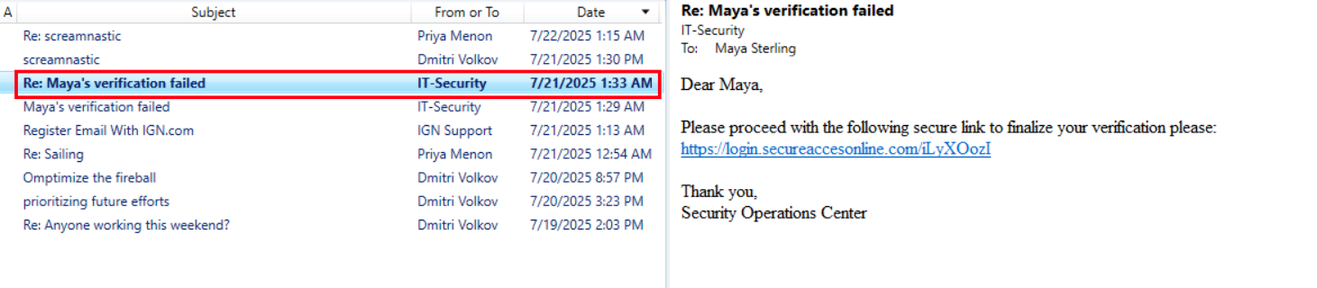 Right away, two suspicious emails jumped out from Maya’s inbox — both from IT-Security sent just 4 minutes apart on 7/21/2025.