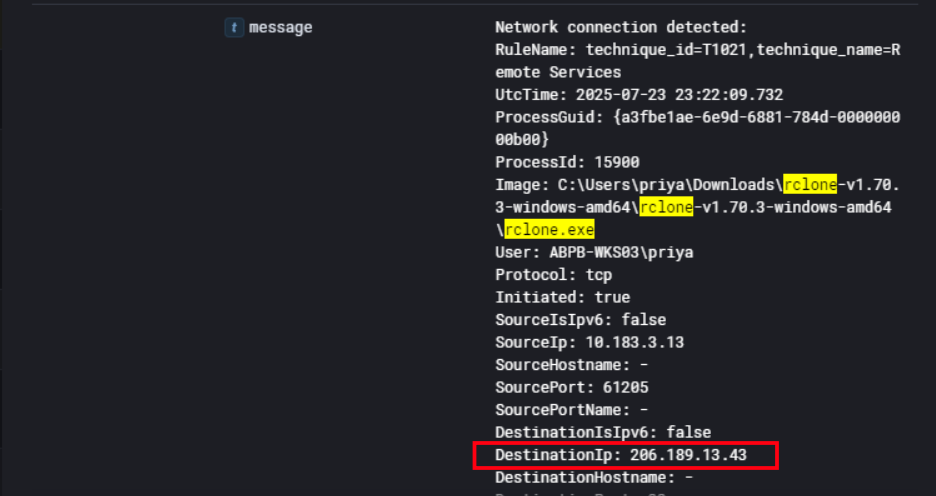 So pulling the network telemetry, we can see rclone.exe initiated an outbound TCP connection from 10.183.3.13 on ABPB-WKS03 under priya’s account to destination IP 206.189.13.43 over port 22 (SFTP). This is the attacker’s C2 server where all the exfiltrated data was being pushed to.