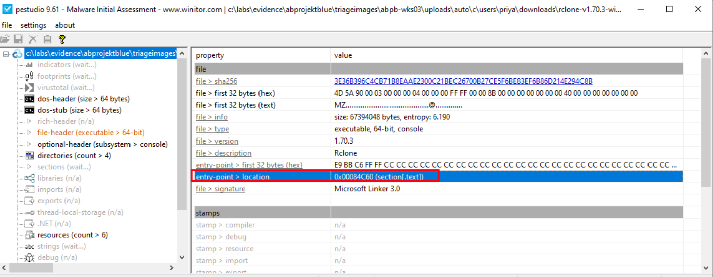 So during static analysis of rclone.exe pulled from ABPB-WKS03, we identified the binary’s entry point address at 0x84c60.