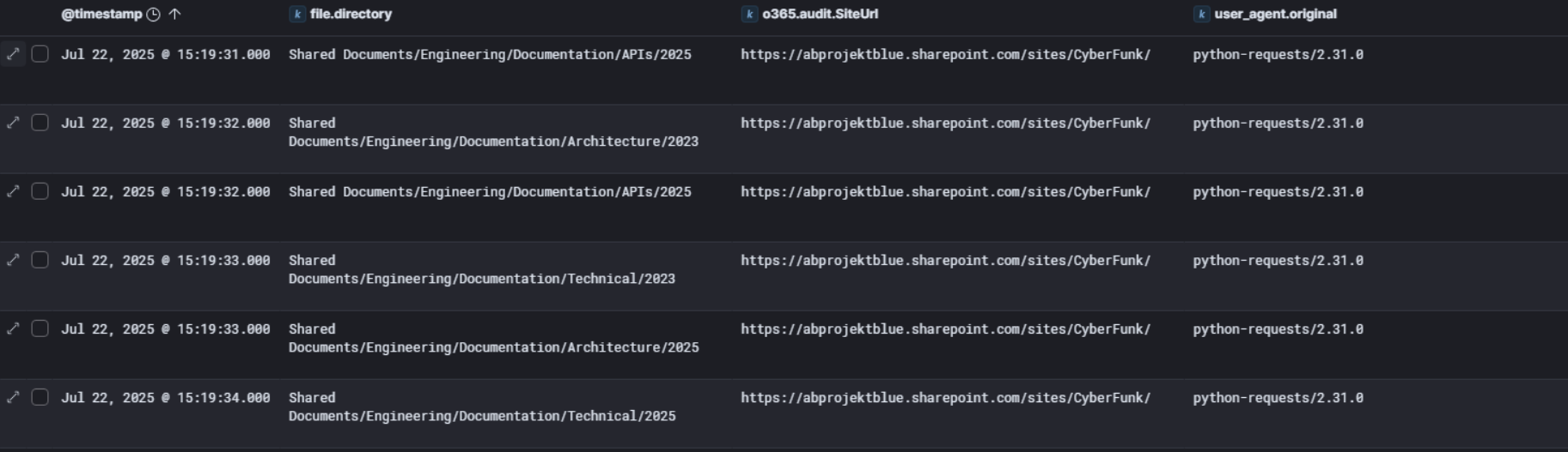 So shifting over to the SharePoint audit logs, we can see the attacker was hitting https://abprojektblue.sharepoint.com/sites/CyberFunk/ and bulk downloading files from the Engineering/Documentation directories including APIs, Architecture, and Technical folders across both 2023 and 2025 content.