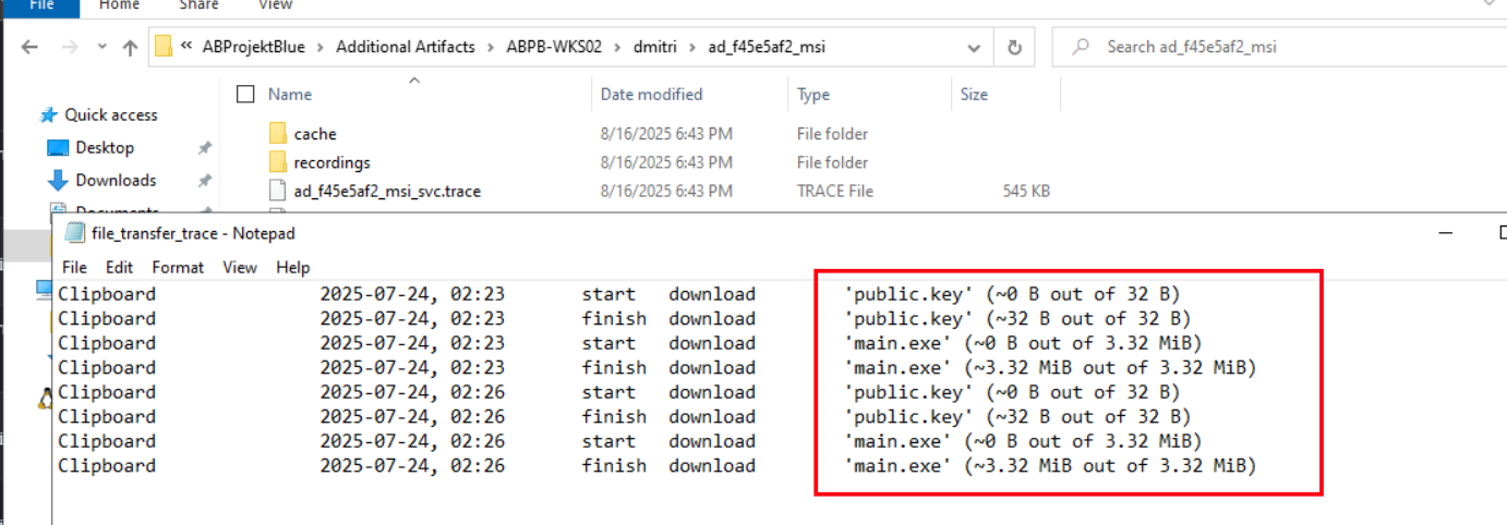 So digging into the AnyDesk artifacts on ABPB-WKS02 under dmitri’s profile, we found a file_transfer_trace log inside the ad_f45e5af2_msi folder. This trace file reveals the attacker used AnyDesk’s clipboard file transfer feature to pull two files off the compromised machine during their remote session.