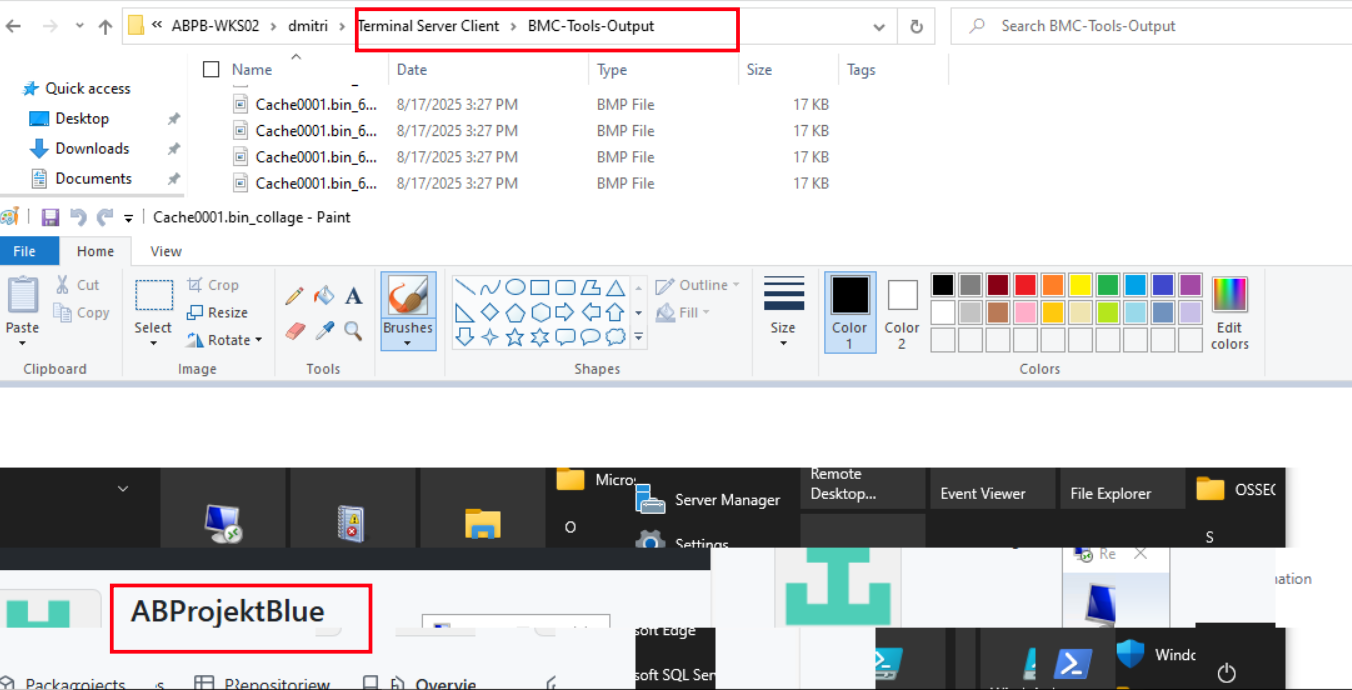 Right there in the reconstructed RDP session screenshot we can clearly see the project directory name ABProjektBlue displayed prominently in the File Explorer title bar and repository browser. This confirms the attacker was actively browsing through the internal development environment and code repositories during their RDP session, giving us a clear visual of exactly what they were looking at inside the compromised environment.