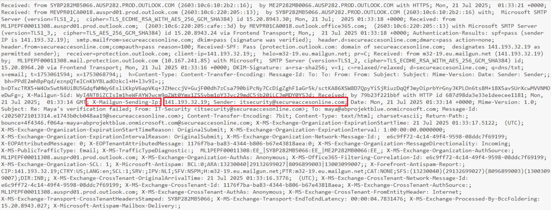 So after pulling the headers out of XstReader, we could clearly see the sending IP was 141.193.32.19 routed through m32-19.eu.mailgun.net. The attacker used Mailgun’s EU infrastructure. Sender is itsecurity@secureaccesonline.com delivered to maya@abprojektblue.onmicrosoft.com. What caught our eye was that SPF, DKIM, DMARC all passed because the attacker properly configured the domain with Mailgun, so Microsoft let it through clean, straight to inbox.