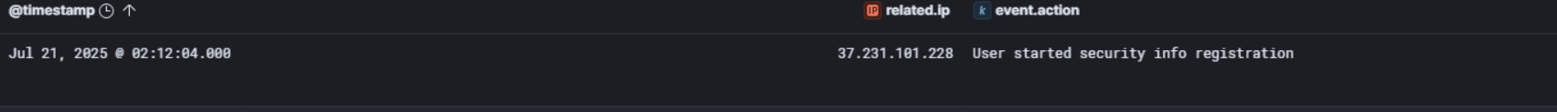 So jumping over to the logs, we can see that on Jul 21, 2025 at 02:12:04 UTC, IP 37.231.101.228 triggered a User started security info registration event under Maya’s account. That’s roughly 39 minutes after the phishing email landed in her inbox at 01:33 AM.
