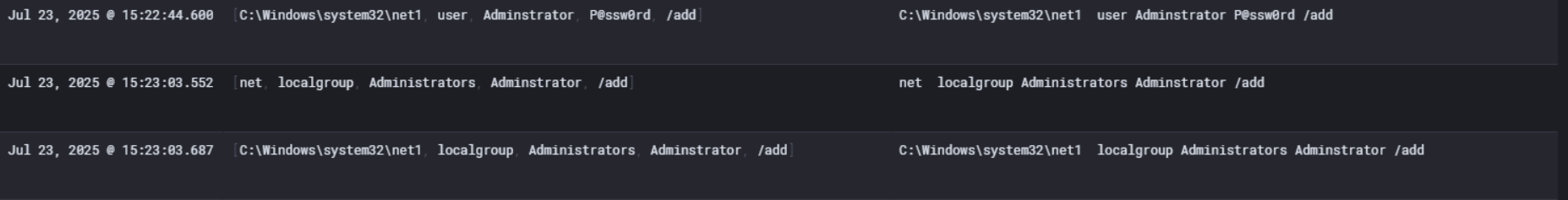 So now things get even more interesting. On ABPB-WKS02 we can see the attacker created a backdoor local account named Adminstrator (notice the deliberate typo, missing one ‘i’) with password P@ssw0rd using net user Adminstrator P@ssw0rd /add.